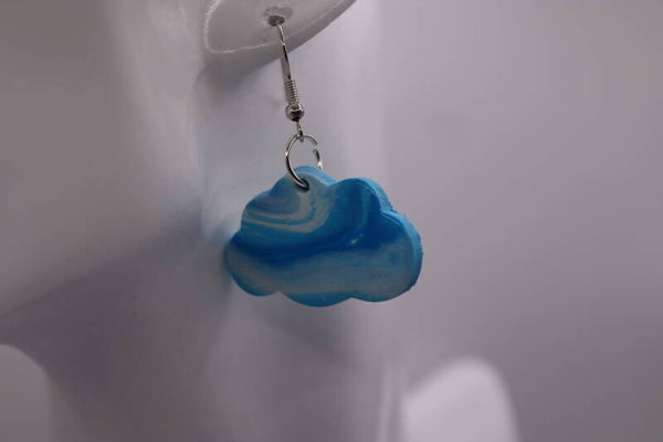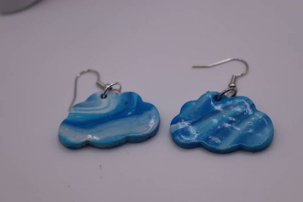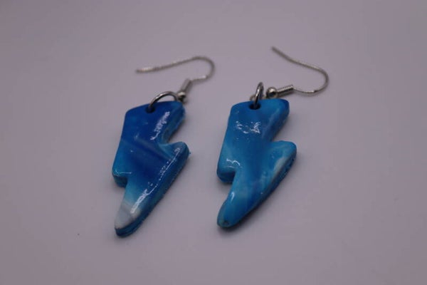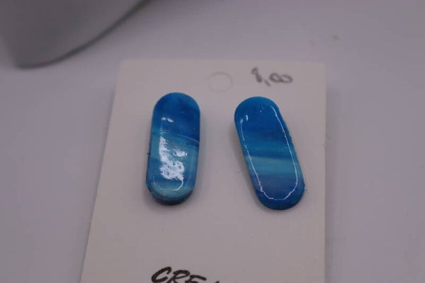 Een paar unieke oorbellen gemaakt in blauwe polymeer. Gemixt met wat wit. Unieke vormen.