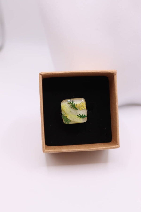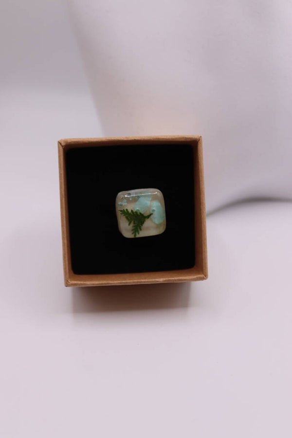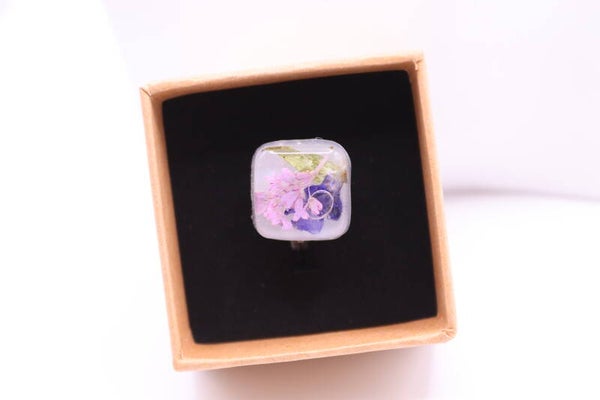 Unieke ring in de vorm van een vierkant gevuld met bloemetjes.